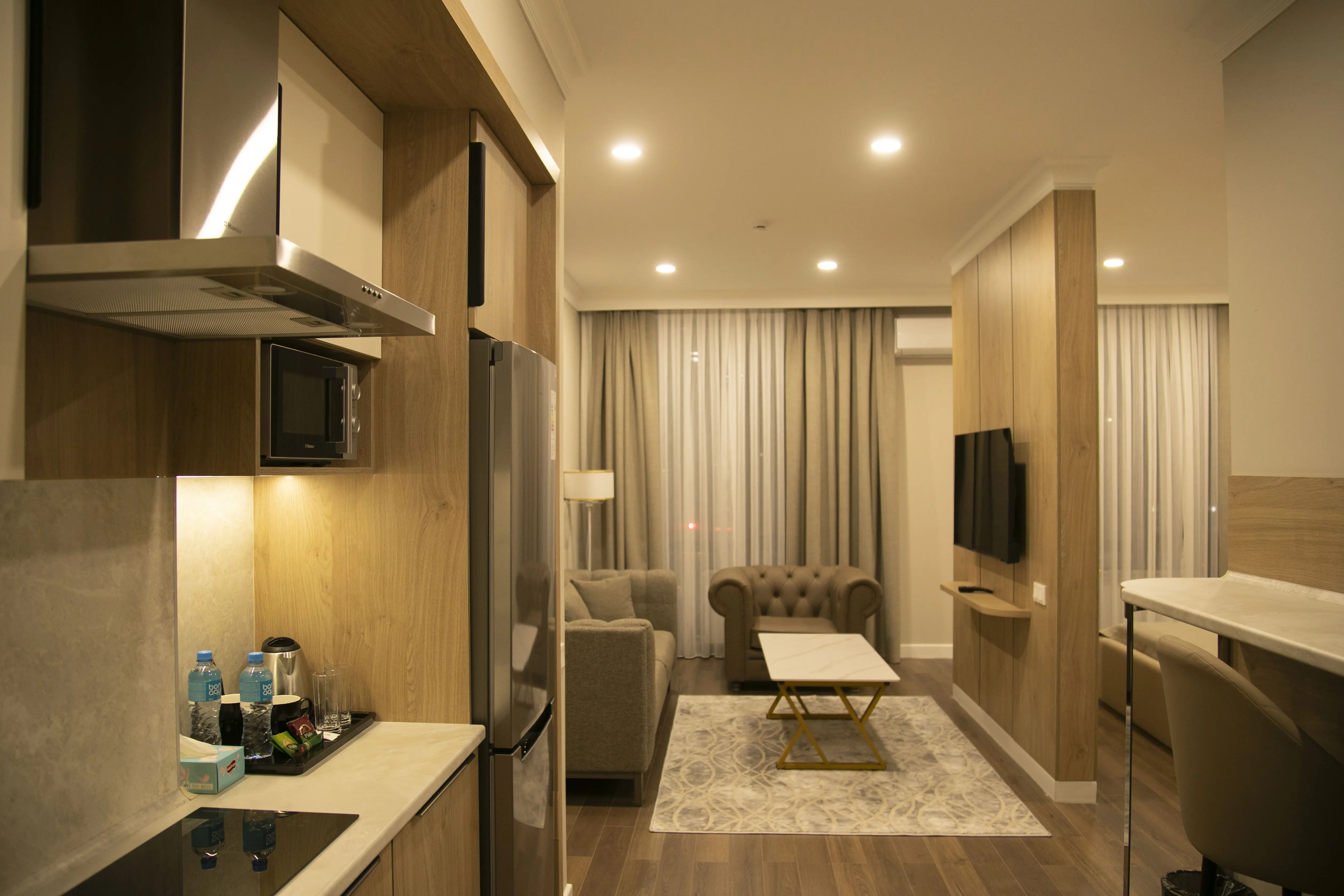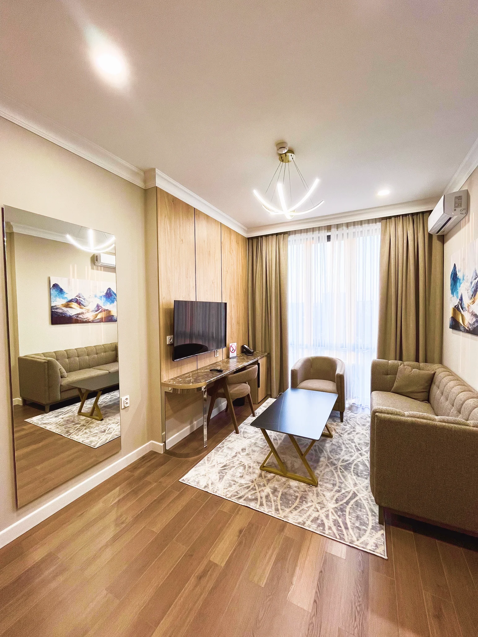 Просторный номер с продуманным зонированием: спальная и гостиная зоны.