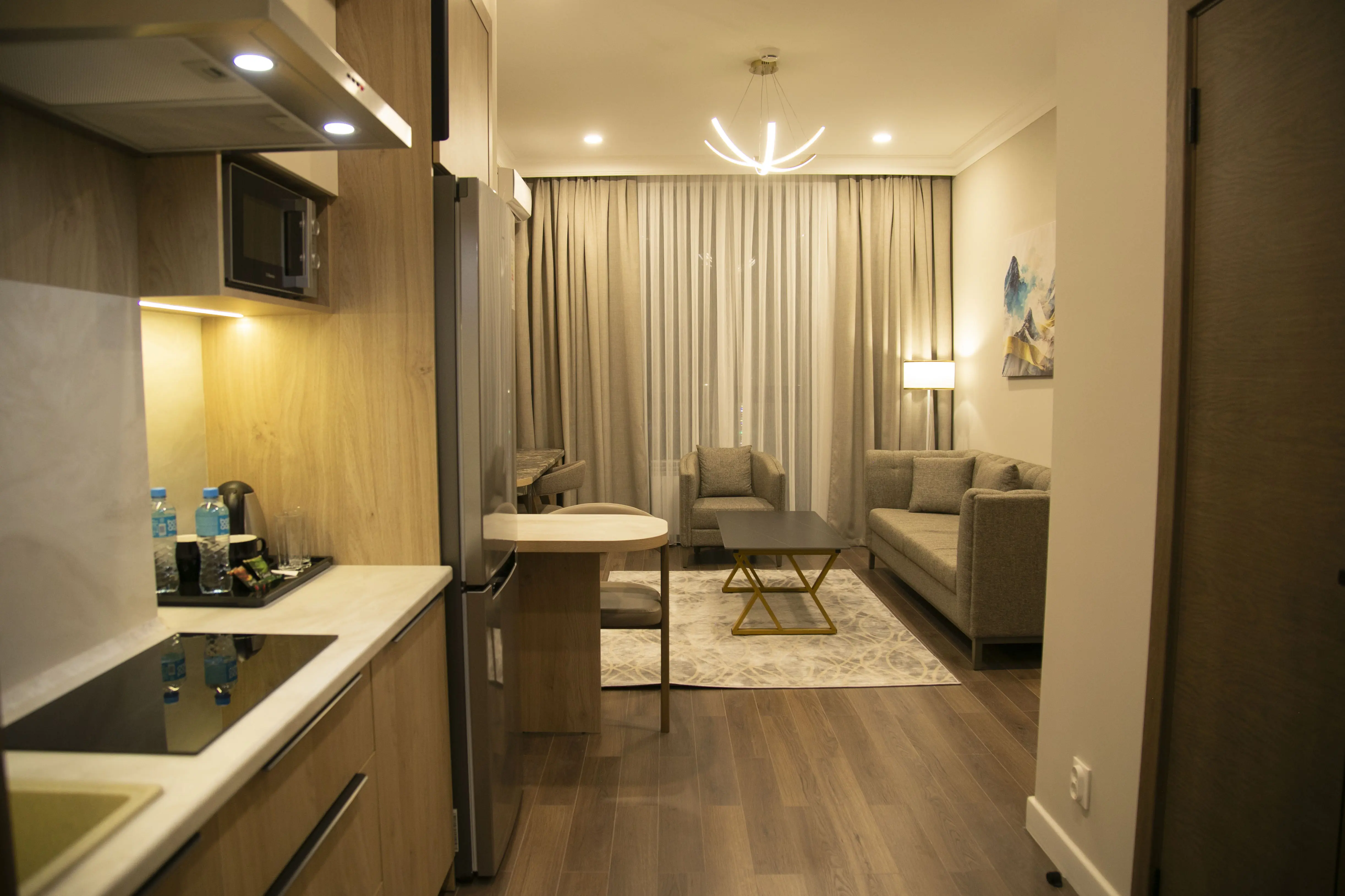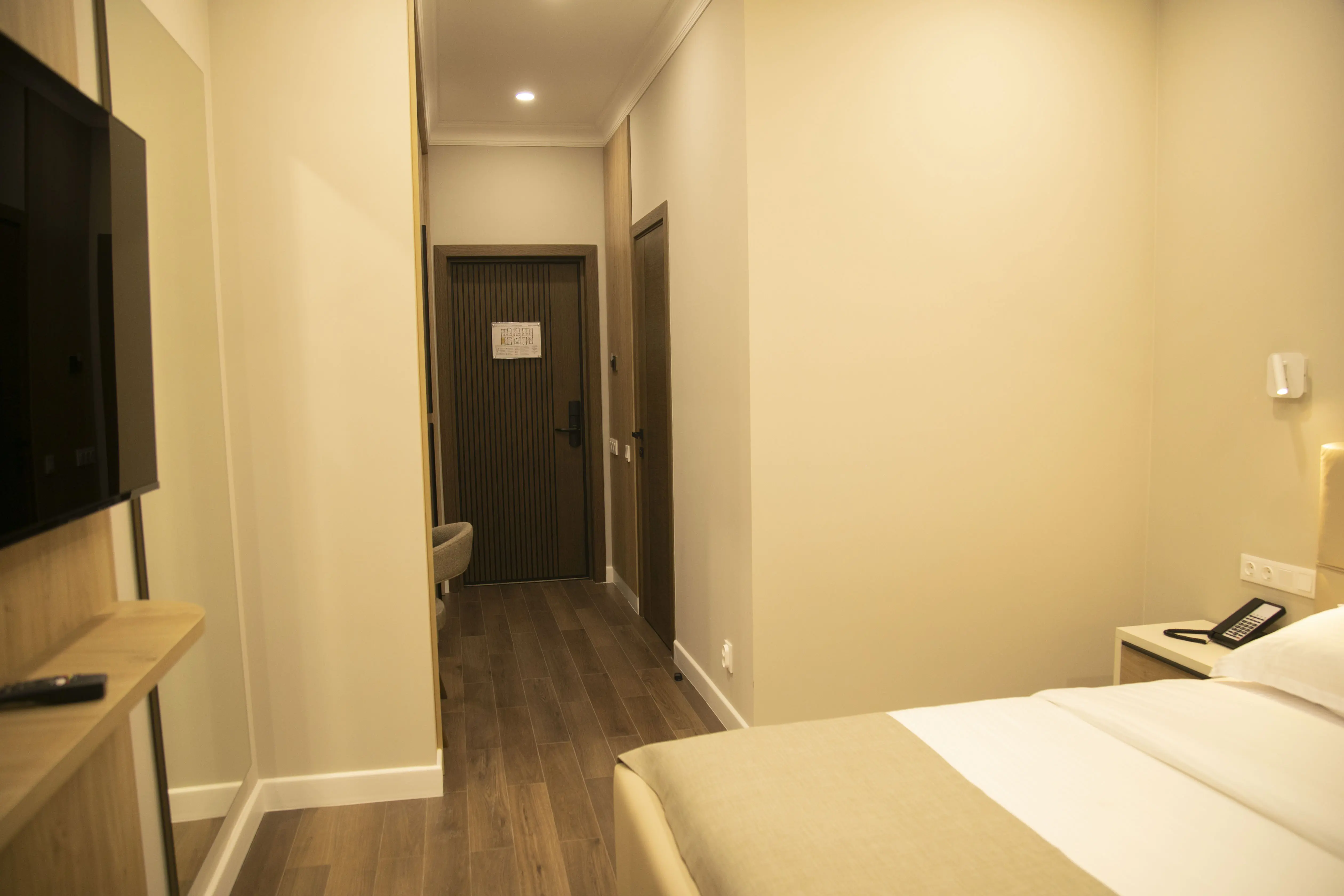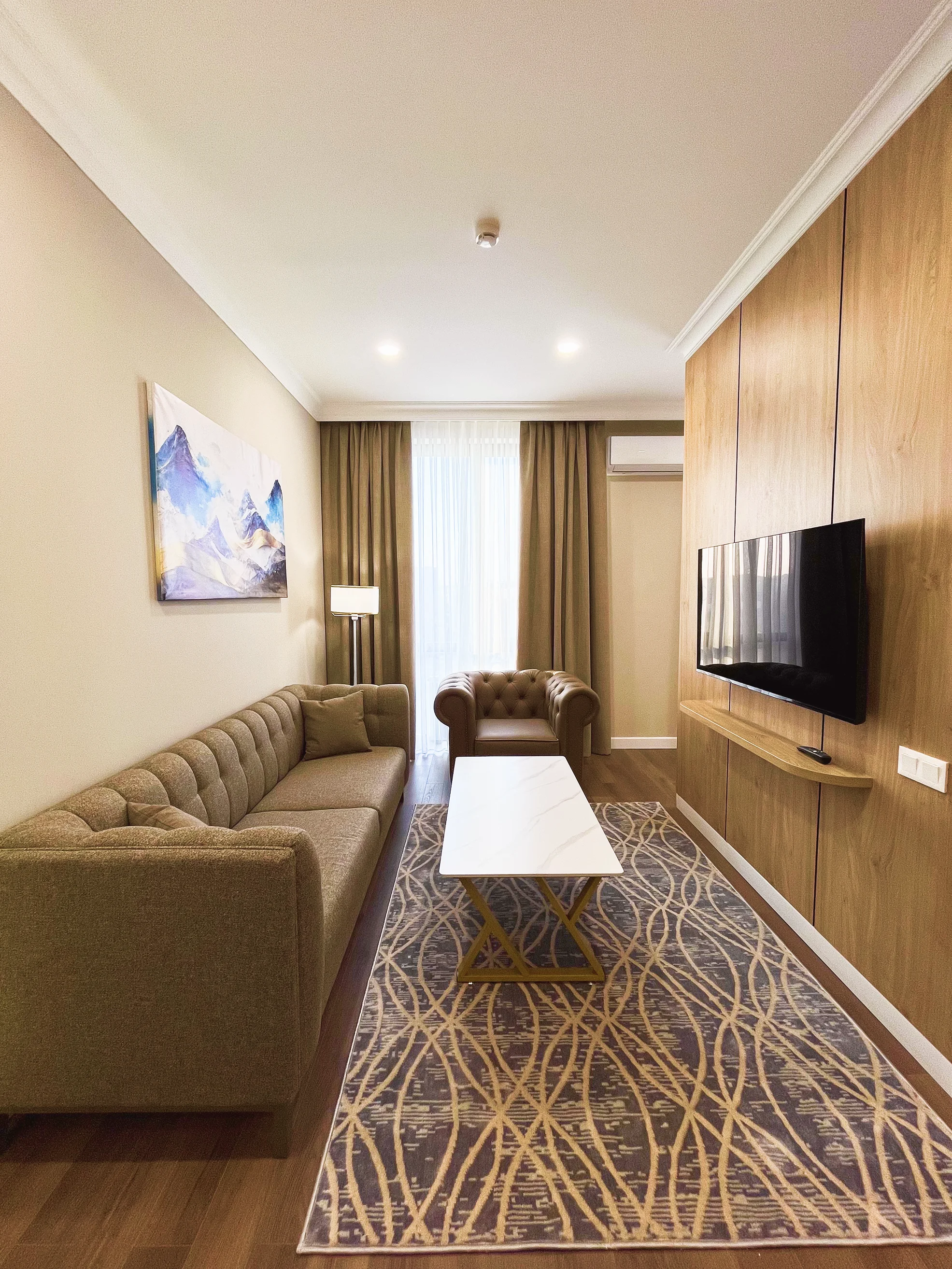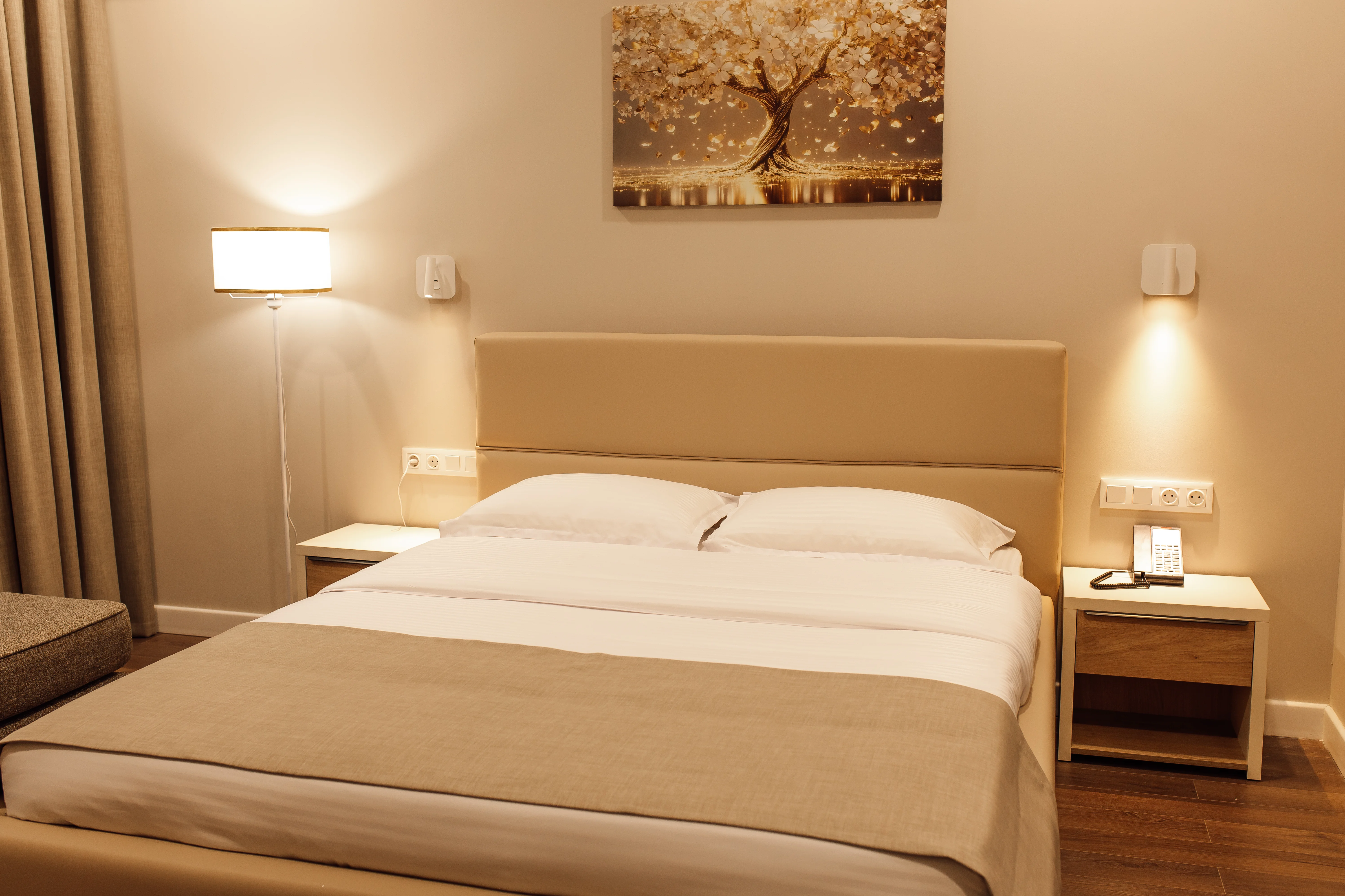 Просторный номер с продуманным зонированием: спальная и гостиная зоны.